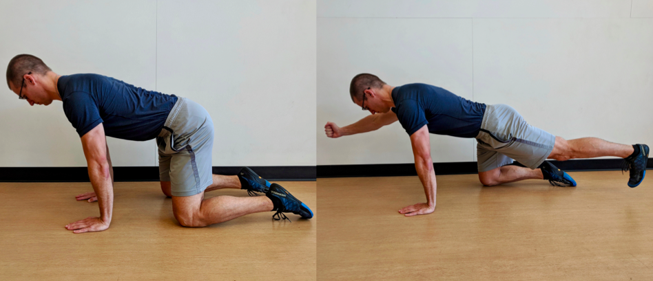Birddogs are a great exercise for beginners with less core capacity or as a warm-up for more advanced training. They begin in a quadruped position with hands under shoulders and knees under hips. From there, adopt a neutral lumbar spine position and brace it in place. Once you feel solid, alternate between extend opposite arms and legs while maintaining trunk position. Be careful to not extend and flex your low back as you respectively reach and draw in the limbs.